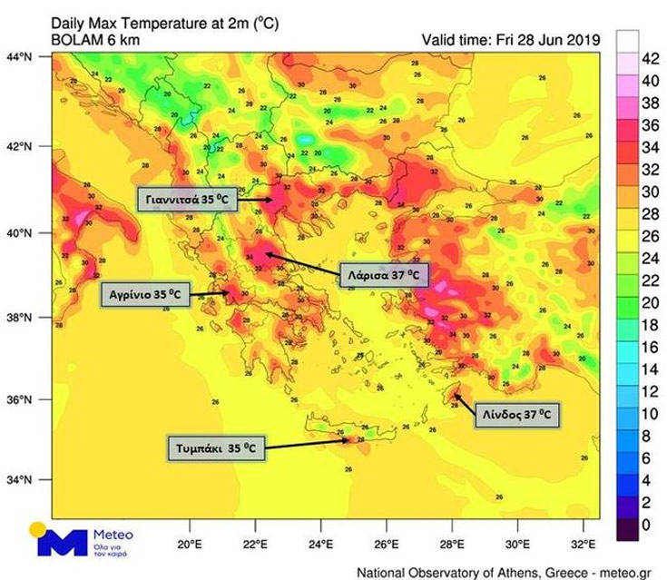Εκτίμηση των μεγίστων θερμοκρασιών κατά τις μεσημεριανές ώρες της Παρασκευής 28/06/2019