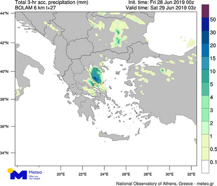 Τα εκτιμώμενα ύψη βροχής (αριστερά) κατά τις απογευματινές ώρες της Παρασκευής 28/06/2019 και (δεξιά) τις πρώτες πρωινές ώρες του Σαββάτου 29/06/2019