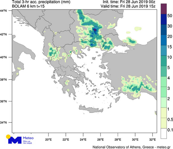Τις μεσημεριανές και απογευματινές ώρες αναμένονται βροχές και τοπικές καταιγίδες στα βόρεια τμήματα (Χάρτης 2, αριστερά), ενώ αργότερα αντίστοιχα φαινόμενα προβλέπονται για τη Θεσσαλία, τις Σποράδες και μέσα στη νύχτα προς τα ξημερώματα του Σαββάτου 29/06 στη Βόρεια Εύβοια και την Κεντρική Στερεά.