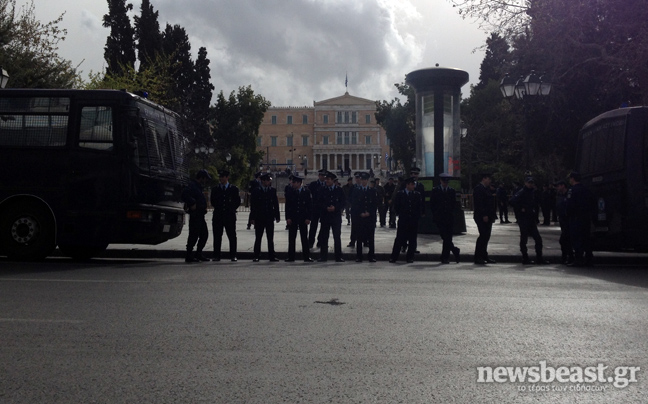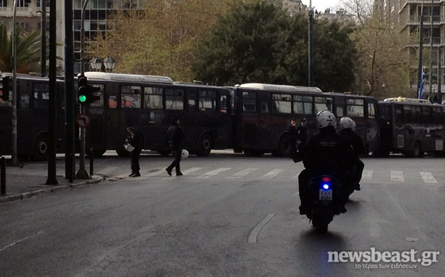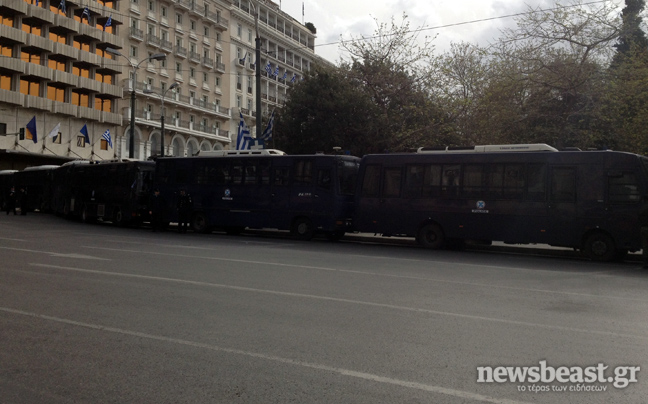 Η κάτω μεριά της πλατείας Συντάγματος είναι απροσπέλαστη από 14 κλούβες των ΜΑΤ, ενώ η ζώνη απαγόρευσης της κυκλοφορίας ξεκινά από τη λεωφόρο Αλεξάνδρας.