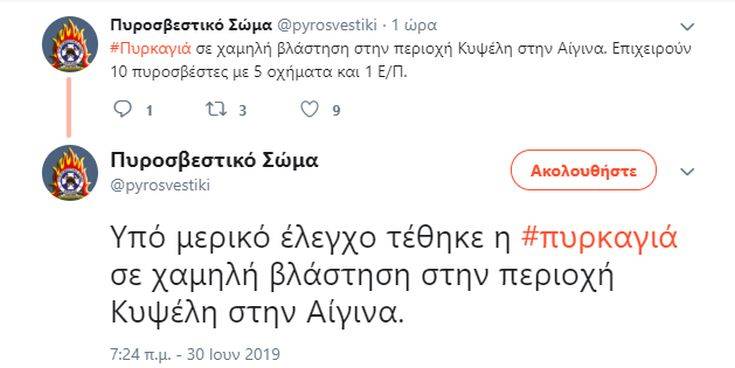 Παράλληλα, όσον αφορά το πύρινο μέτωπο στην Αίγινα, αυτό τέθηκε υπό μερικό έλεγχο. Η φωτιά είχε ξεσπάσει σε περιοχή με χαμηλή βλάστηση, στην Κυψέλη.