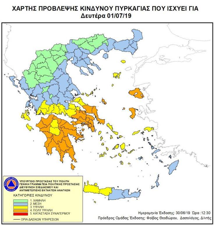 Πολύ υψηλός κίνδυνος είναι και σήμερα ο κίνδυνος πυρκαγιάς, ενώ ο δρόμος που ανεβαίνει στον λόφο του Λυκαβηττού έκλεισε και πάλι. Σύμφωνα με τον Χάρτη Πρόβλεψης Κινδύνου Πυρκαγιάς που εκδίδει η Γενική Γραμματεία Πολιτικής Προστασίας του Υπουργείου Προστασίας του Πολίτη, για σήμερα Δευτέρα 01 Ιουλίου 2019, προβλέπεται πολύ υψηλός κίνδυνος πυρκαγιάς (κατηγορία κινδύνου 4) για τις εξής περιοχές: