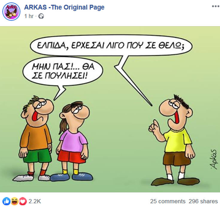 Μέσα σε μία ώρα ανήρτησε δύο εικόνες. Στην πρώτη ο νεαρός πρωθυπουργός λέει «Ελπίδα έρχεσαι λίγο που σε θέλω;» και ένας άλλος νεαρός λέει «μην πας, θα σε πουλήσει».