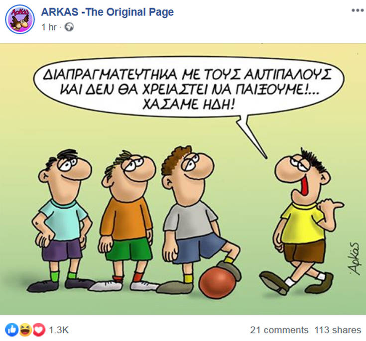Στο δεύτερο σκίτσο ο νεαρός πρωθυπουργός λέει σε μια παρέα φίλων του πριν παίξουν μπάλα: «Διαπραγματεύτηκα με τους αντιπάλους και δεν θα χρειαστεί να παίξουμε! Χάσαμε ήδη!».