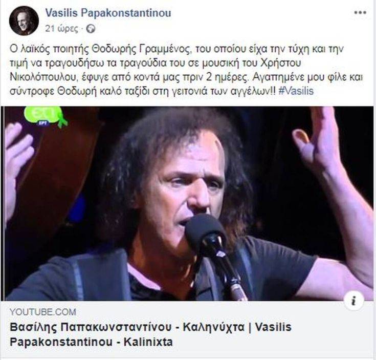 «O λαϊκός ποιητής Θοδωρής Γραμμένος, του οποίου είχα την τύχη και την τιμή να τραγουδήσω τα τραγούδια του σε μουσική του Χρήστου Νικολόπουλου, έφυγε από κοντά μας πριν 2 ημέρες. Αγαπημένε μου φίλε και σύντροφε Θοδωρή καλό ταξίδι στη γειτονιά των αγγέλων!!».