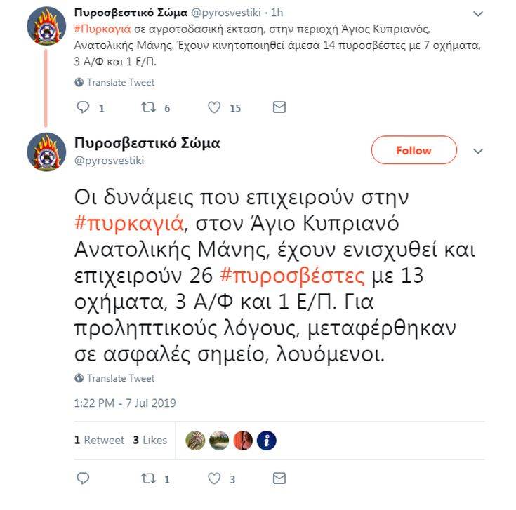 Οι δυνάμεις που επιχειρούν στη φωτιά που έχει ξεσπάσει στην περιοχή του Αγίου Κυπριανού στην Ανατολική Μάνη έχουν ενισχυθεί και επιχειρούν 26 πυροσβέστες, με 13 οχήματα της υπηρεσίας, σύμφωνα με ανακοίνωση του Πυροσβεστικού Σώματος.