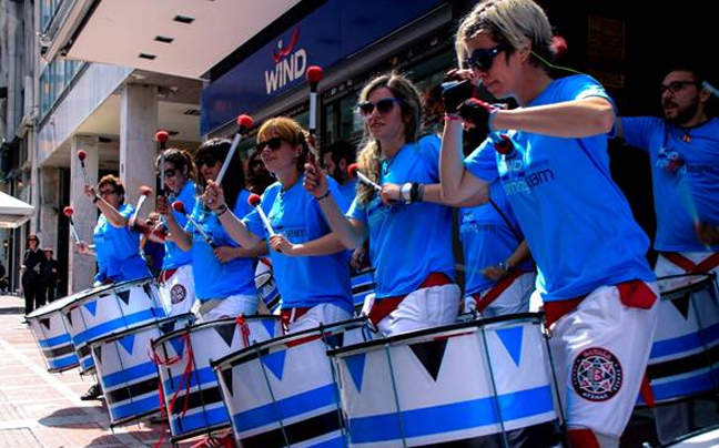 Η οδός Σταδίου πλημμύρισε από τους δυνατούς ήχους των BATALA, που ντυμένοι στα χρώματα της WIND, ξεσήκωναν με τα τύμπανά τους και το δυναμικό χορό τους σε ρυθμούς samba & reggae, τους δρομείς στο πέρασμά τους.