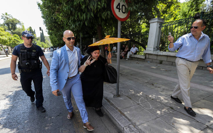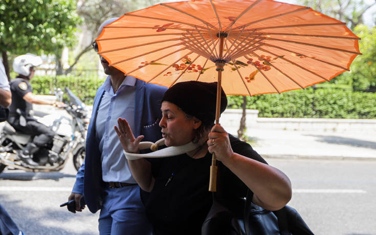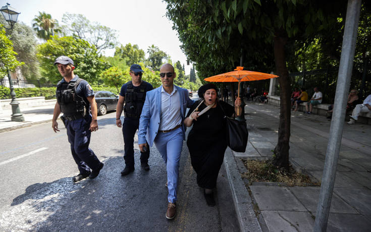 Έξω όμως από το Μαξίμου τις εντυπώσεις έκλεψε η παρουσία της Ελένης Λουκά, η οποία πραγματοποίησε τη δική της διαμαρτυρία, κρατώντας μία πορτοκαλί ομπρέλα.
