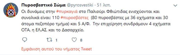 Στο σημείο έχουν σπεύσει 80 πυροσβέστες με 36 οχήματα και 30 άτομα πεζοπόρο τμήμα και 5 αεροσκάφη. Την επιχείρηση συνδράμουν 4 οχήματα της Περιφέρειας, η ΕΛ.ΑΣ. και το Δασαρχείο.