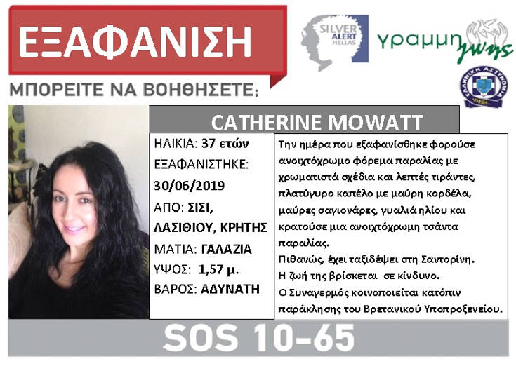 Συναγερμός silver alert, έχει εκδοθεί για την ανεύρεση της 37χρονης Catherine Mowatt στη Κρήτη.