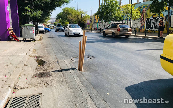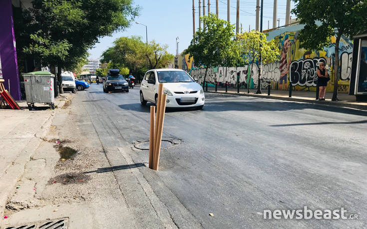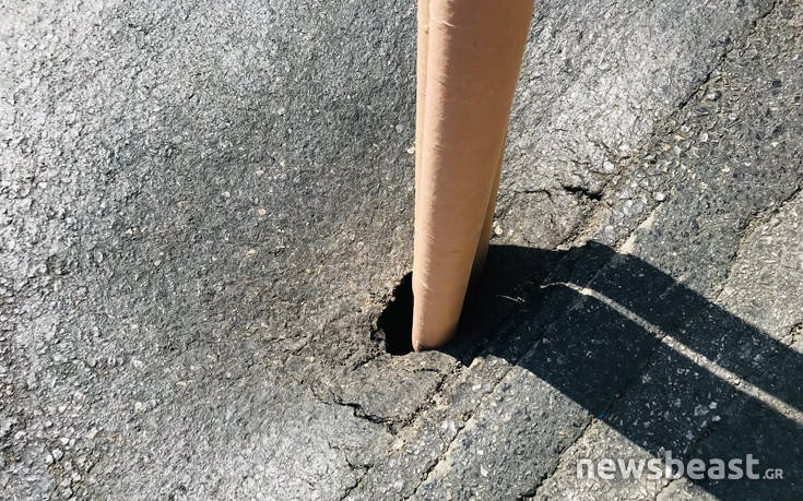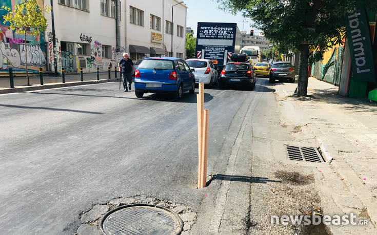 Έναν παράξενο τρόπο βρήκαν κάποιοι για να κλείσουν μία τρύπα στην Οδό Λιοσίων 127, λίγο μετά τον σταθμό Αττικής.