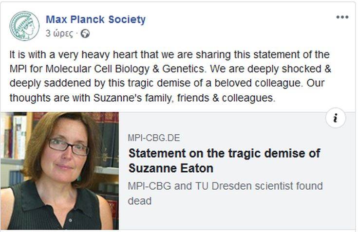 Το γερμανικό Ινστιτούτο, στο οποίο εργαζόταν η Suzanne Eaton, δημοσίευσε ένα συλλυπητήριο post στη σελίδα του στο facebook.