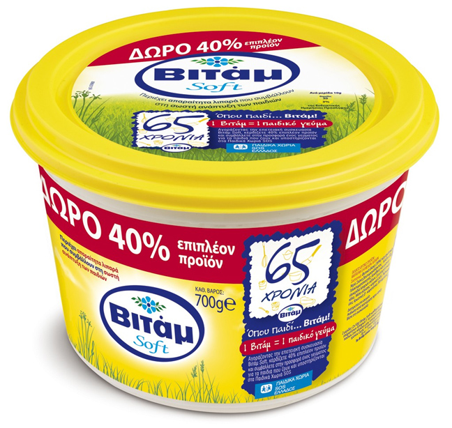 Αναζητείστε τις ειδικές συσκευασίες Βιτάμ, συμβάλλετε και εσείς στο πολύ σημαντικό έργο των παιδικών χωριών SOS προσφέροντας ένα γεύμα και κερδίστε 40% περισσότερο προϊόν για εσάς και την οικογένειά σας.