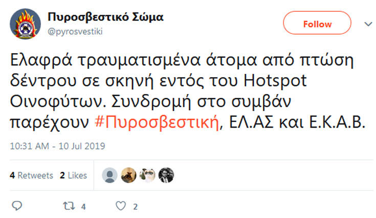 Συνολικά 7 άνθρωποι τραυματίστηκαν από πτώση δέντρου σε σκηνή εντός του Hotspot Οινοφύτων. Σύμφωνα με πληροφορίες της ΕΡΤ, ανάμεσα στους τραυματίες είναι και δυο παιδιά.