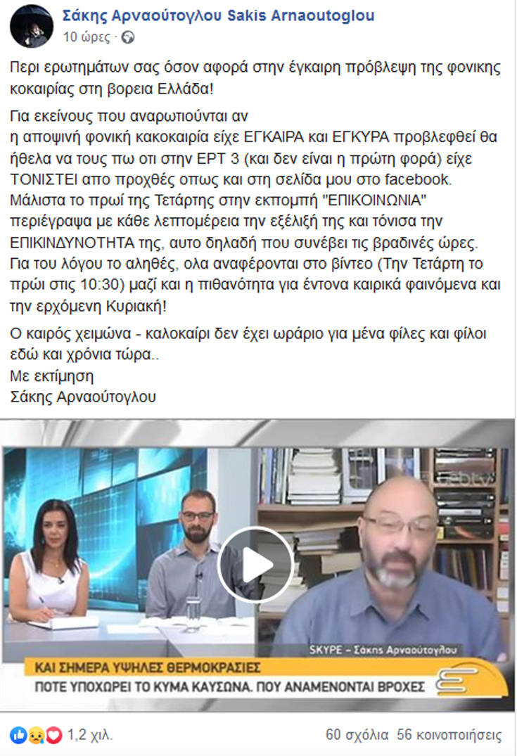 Περι ερωτημάτων σας όσον αφορά στην έγκαιρη πρόβλεψη της φονικης κοκαιρίας στη βορεια Ελλάδα! Για εκείνους που αναρωτιούνται αν η αποψινή φονική κακοκαιρία είχε ΕΓΚΑΙΡΑ και ΕΓΚΥΡΑ προβλεφθεί θα ήθελα να τους πω οτι στην ΕΡΤ 3 (και δεν είναι η πρώτη φορά) είχε ΤΟΝΙΣΤΕΙ απο προχθές οπως και στη σελίδα μου στο facebook. Μάλιστα το πρωί της Τετάρτης στην εκπομπή "ΕΠΙΚΟΙΝΩΝΙΑ" περιέγραψα με κάθε λεπτομέρεια την εξέλιξή της και τόνισα την ΕΠΙΚΙΝΔΥΝΟΤΗΤΑ της, αυτο δηλαδή που συνέβει τις βραδινές ώρες. Για του λόγου το αληθές, ολα αναφέρονται στο βίντεο (Την Τετάρτη το πρώι στις 10:30) μαζί και η πιθανότητα για έντονα καιρικά φαινόμενα και την ερχόμενη Κυριακή!Ο καιρός χειμώνα – καλοκαίρι δεν έχει ωράριο για μένα φίλες και φίλοι εδώ και χρόνια τώρα.. Με εκτίμησηΣάκης Αρναούτογλου