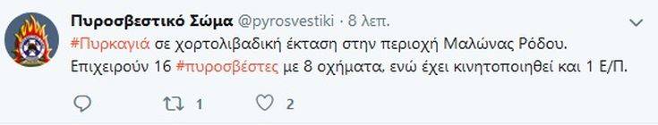 Φωτιά έχει ξεσπάσει στην περιοχή Μαλώνας Ρόδου, όπου καίγεται χορτολιβαδική έκταση.