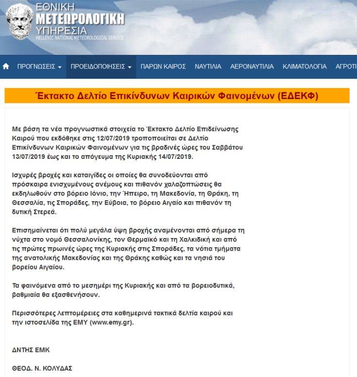 Σύμφωνα με την ανακοίνωση, επισημαίνεται ότι πολύ μεγάλα ύψη βροχής αναμένονται από σήμερα τη νύχτα στο νομό Θεσσαλονίκης, τον Θερμαϊκό και τη Χαλκιδική και από τις πρώτες πρωινές ώρες της Κυριακής στις Σποράδες, τα νότια τμήματα της ανατολικής Μακεδονίας και της Θράκης καθώς και τα νησιά του βορείου Αιγαίου.