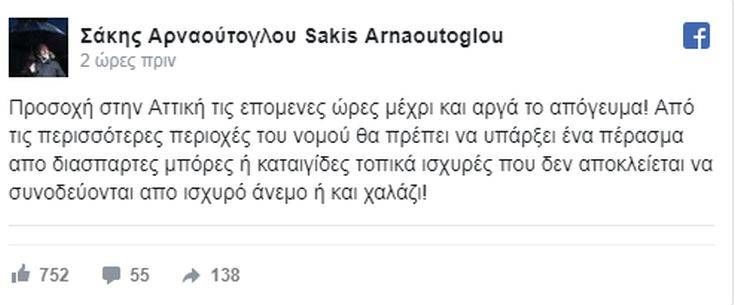 O μετεωρολόγος Σάκης Αρναούτογλου προειδοποιεί για το κύμα κακοκαιρίας «Αντίνοος» και μιλά για επιδείνωση στον νομό της Αττικής. Δείτε τι ανάρτησε στον λογαριασμό του στο facebook: