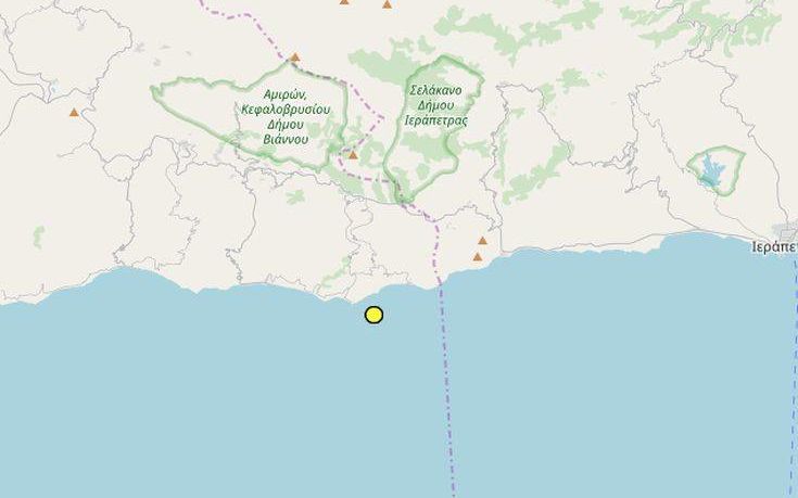 Σεισμός 3,9 βαθμών της κλίμακας Ρίχτερ σημειώθηκε στις 16:12, 21 χιλιόμετρα δυτικά της Ιεράπετρας στην Κρήτη, σύμφωνα με το Γεωδυναμικό Ινστιτούτο του Εθνικού Αστεροσκοπείου Αθηνών.