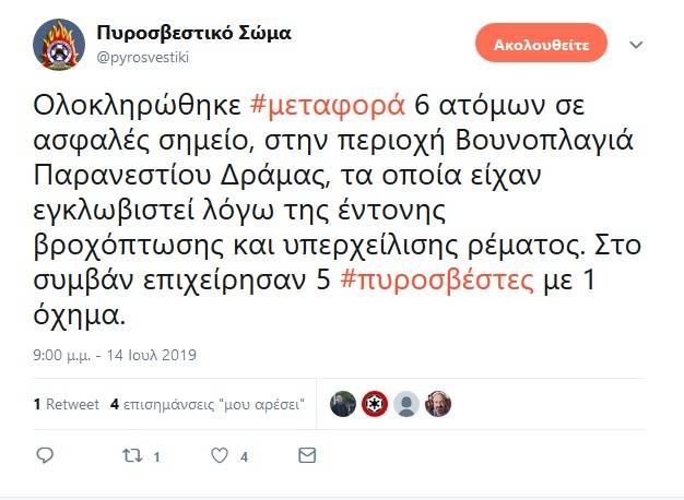 Συναγερμός σήμανε στην Πυροσβεστική υπηρεσία, όταν πέντε γυναίκες και ένα παιδί 9 ετών εγκλωβίστηκαν από υπερχείλιση ρέματος στη Δράμα.