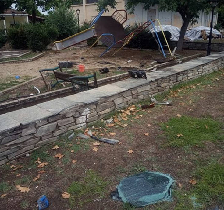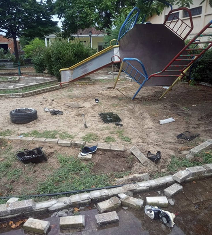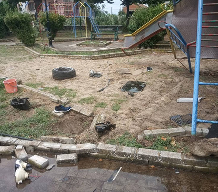 Οι φωτογραφίες δείχνουν τις ζημιές που προκλήθηκαν στην παιδική χαρά. Σύμφωνα με πληροφορίες, την ώρα του περιστατικού στην περιοχή είχε ξεκινήσει βροχή.