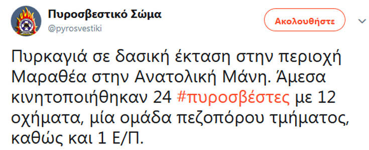 Πιο συγκεκριμένα, η φωτιά ξέσπασε σε δασική έκταση στην περιοχή Μαραθέα στην Ανατολική Μάνη.
