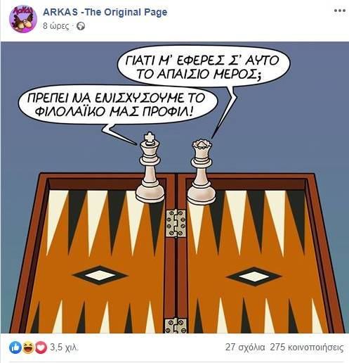 Στο σκίτσο πρωταγωνιστούν ο βασιλιάς και η βασίλισσα από το σκάκι οι οποίοι όμως βρίσκονται μέσα σε ένα τάβλι.