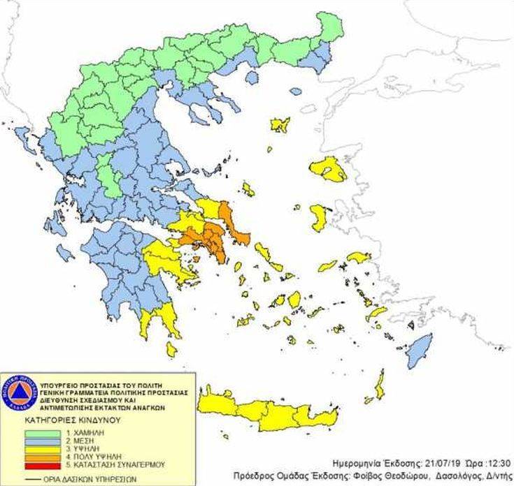 Εν τω μεταξύ σήμερα Δευτέρα 22 Ιουλίου, πολύ υψηλός κίνδυνος πυρκαγιάς (κατηγορία κινδύνου 4) προβλέπεται στην Περιφέρεια Αττικής και στην Περιφέρεια Στερεάς Ελλάδος (Εύβοια), σύμφωνα με το χάρτη Πρόβλεψης Κινδύνου Πυρκαγιάς που εκδίδει η Γενική Γραμματεία Πολιτικής Προστασίας του υπουργείου Προστασίας του Πολίτη.