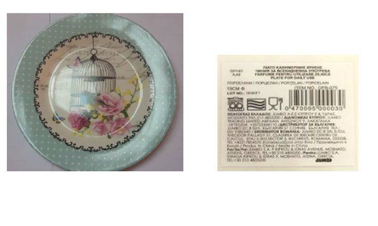 Πρόκειται για πιάτο καθημερινής χρήσης από πορσελάνη με διάμετρο 19 cm, προέλευσης Κίνας, με κωδικό προϊόντος ITEMNO:DFB-075, αριθμό παρτίδας 16HKF7 και αριθμό γραμμοκώδικα 0470095000030.