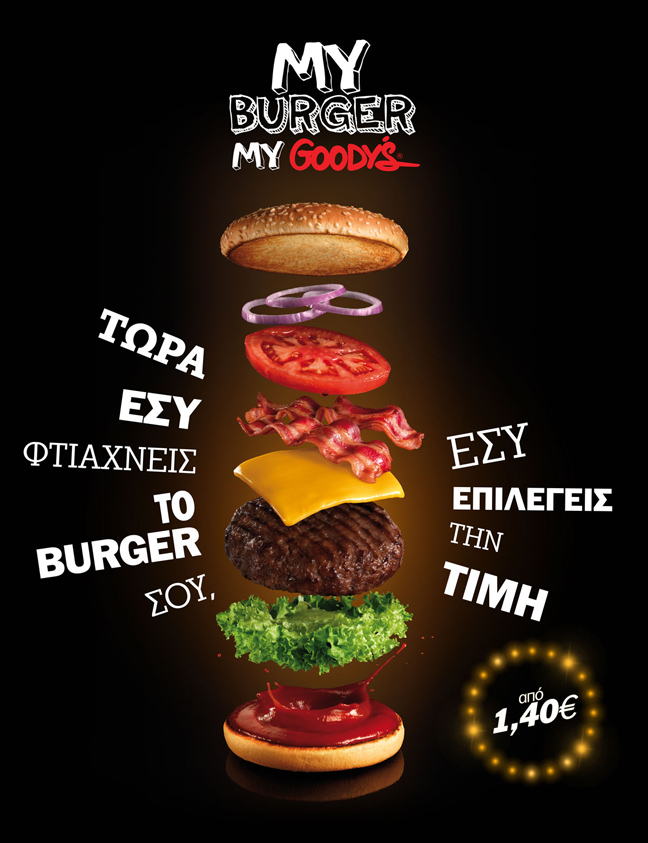 Από σήμερα σε όλα τα Goody’s το burger γίνεται προσωπική σου υπόθεση, με τα υλικά που προτιμάς, στην τιμή που επιλέγεις ακόμα και με τη φωτογραφία σου! Και όλα αυτά μόνο από 1,40 ευρώ! Απίστευτο; Κι όμως, γίνεται!