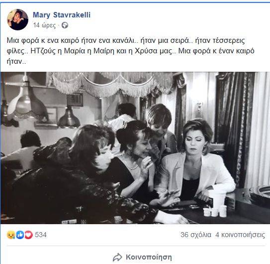 «Μια φορά κ ένα καιρό… ήταν ένα κανάλι… ήταν μια σειρά.. ήταν τέσσερις φίλες.. Η Τζόυς η Μαρία η Μαίρη και η Χρύσα μας… Μια φορά κ ένα καιρό ήταν…» έγραψε η Μαίρη Σταυρακέλλη και συνόδευσε το συγκινητικό μήνυμα της στο Facebook με μια ασπρόμαυρη φωτογραφία από τα γυρίσματα…