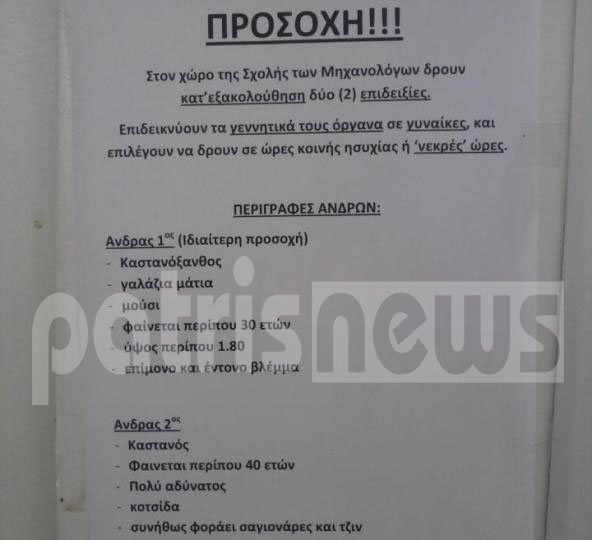 Όπως αναφέρει το patrisnews.gr, η ανακοίνωση προειδοποιεί τις ανυποψίαστες φοιτήτριες για την ύπαρξη δύο επιδειξιών που δρουν εντός της σχολής.