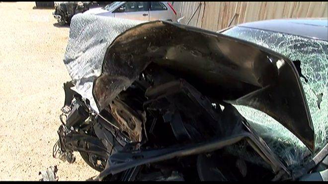 Το μπροστινό μέρος του οχήματος έχει διαλυθεί από τη σφοδρή σύγκρουση με το δέντρο που βρίσκεται στο πεζοδρόμιο στη Λεωφόρο Τραπεζούντος. Το καπό έχει τσαλακωθεί σαν ένα κομμάτι χαρτί, ενώ ο κινητήρας έχει εξαφανιστεί και το παρμπρίζ έχει γίνει θρύψαλα.