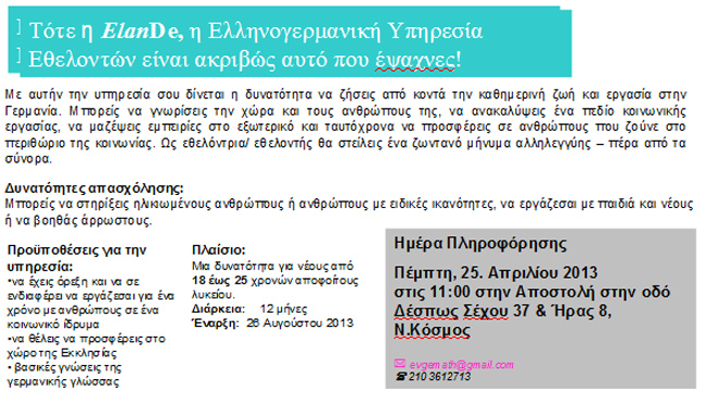 Στην εκδήλωση θα παρευρεθούν αντιπρόσωποι από τις δομές της Γερμανίας που θα απασχολήσουν τους εθελοντές, ώστε να ενημερώσουν για το πρόγραμμα και τις προϋποθέσεις συμμετοχής.