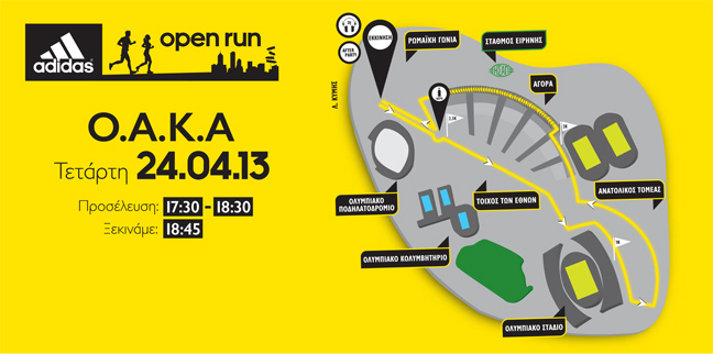 Αν και για σένα το τρέξιμο δεν είναι αγώνας, αλλά διασκέδαση, έλα την Τετάρτη 24 Απριλίου, στις 18:30 (οι εγγραφές ξεκινάνε από τις 17:30), στο ΟΑΚΑ (Είσοδος Α’ από Λ. Κύμης), και τρέξε με την παρέα σου στο 2ο adidas Open Run. Εξειδικευμένοι προπονητές θα βρίσκονται εκεί για να σου δώσουν συμβουλές και προπονητικά tips, ενώ θα έχεις την ευκαιρία να γνωρίσεις από κοντά τα τελευταία running προϊόντα της adidas και να μπεις σε κλήρωση για να κερδίσεις running εξοπλισμό αξίας 500 ευρώ!