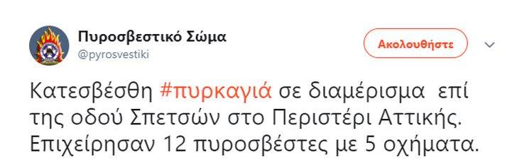 Πιο συγκεκριμένα, πυρκαγιά προκλήθηκε σε διαμέρισμα επί της οδού Σπετσών, στο Περιστέρι. Σε αυτήν επιχείρησαν 12 πυροσβέστες με 5 οχήματα, που τελικά κατάφεραν και έσβησαν τις φλόγες.