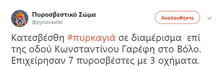 Στο δεύτερο περιστατικό, φωτιά προκλήθηκε σε διαμέρισμα επί της οδού Κωνσταντίνου Γαρέφη, στον Βόλο. Στο περιστατικό επιχείρησαν 7 πυροσβέστες με 3 οχήματα και τελικά κατάφεραν να το αντιμετωπίσουν.