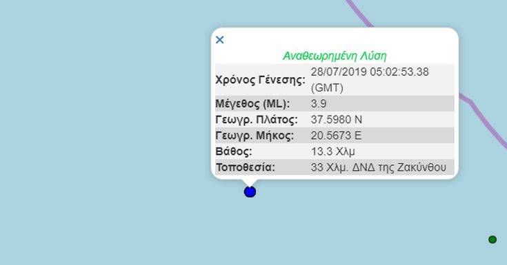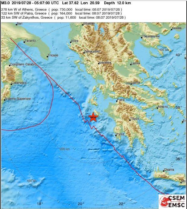 Σεισμική δόνηση 3,9 βαθμών της κλίμακας Ρίχτερ σημειώθηκε λίγο πριν τις 8 το πρωί, 33 χιλιόμετρα νοτιοδυτικά της Ζακύνθου.