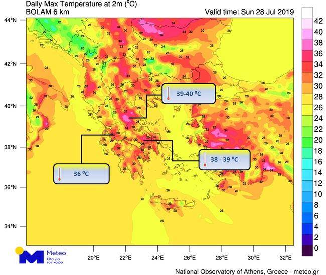 Σήμερα, Κυριακή 28/07 ο υδράργυρος αναμένεται να φτάσει στους 40 βαθμούς στη Θεσσαλία και στους 38-39 βαθμούς στα υπόλοιπα ηπειρωτικά. Στον προγνωστικό χάρτη που ακολουθεί διακρίνονται οι περιοχές όπου περιμένουμε να σημειωθούν οι υψηλότερες μέγιστες θερμοκρασίες, σύμφωνα με το meteo.gr.