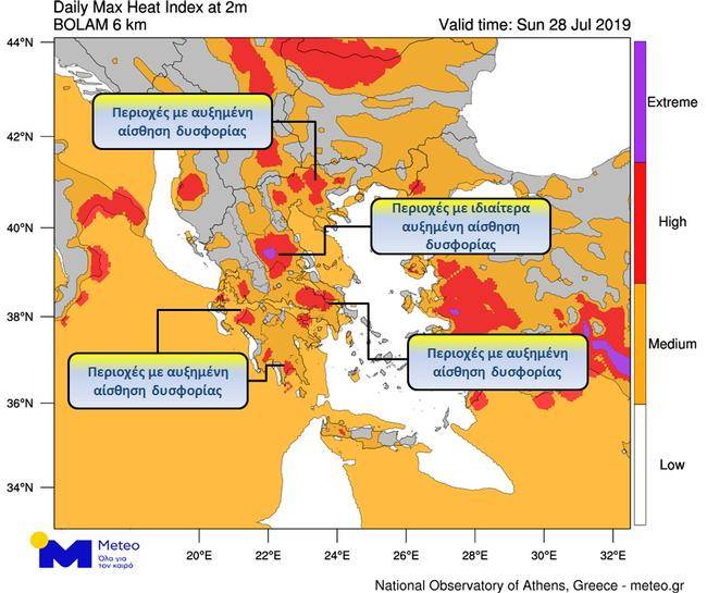 Επισημαίνεται ότι λόγω των εξασθενημένων ανέμων η αίσθηση δυσφορίας θα είναι αυξημένη στα ηπειρωτικά και ιδιαίτερα αυξημένη στη Θεσσαλία, όπως φαίνεται και στο χάρτη που ακολουθεί.