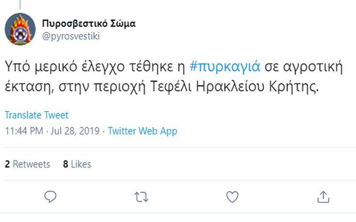 Υπό μερικό έλεγχο τέθηκε η φωτιά που ξέσπασε το βράδυ της Κυριακής στην περιοχή Τεφέλι του Ηρακλείου Κρήτης, σύμφωνα με την ανακοίνωση του Πυροσβεστικού Σώματος.