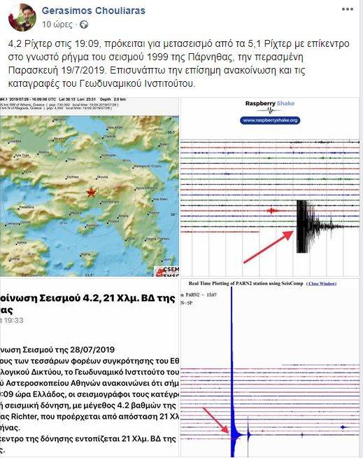 Και ο Γεράσιμος Χουλιαράς υποστηρίζει πως πρόκειται για μετασεισμό γράφοντας χαρακτηριστικά στον προσωπικό του λογαριασμό στο Facebook: «4,1 Ρίχτερ στις 19:09, πρόκειται για μετασεισμό από τα 5,1 Ρίχτερ με επίκεντρο στην Πάρνηθα την περασμένη Παρασκευή 19/7/2019».