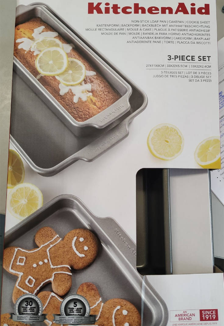 Πρόκειται για το σετ «Kitchenaid σετ 3 τεμαχίων», αντικολλητική φόρμα ψωμιού, ορθογώνια φόρμα κέικ και λαμαρίνα για μπισκότα.
