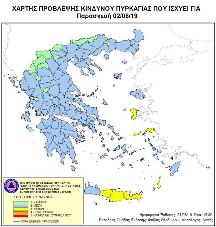 Σύμφωνα με τον χάρτη που εκδίδει, υψηλό κίνδυνο πυρκαγιάς αντιμετωπίζουν η Χίος, η Σάμος, η Ικαρία, η Κάσος, η Κάρπαθος και η Κρήτη.