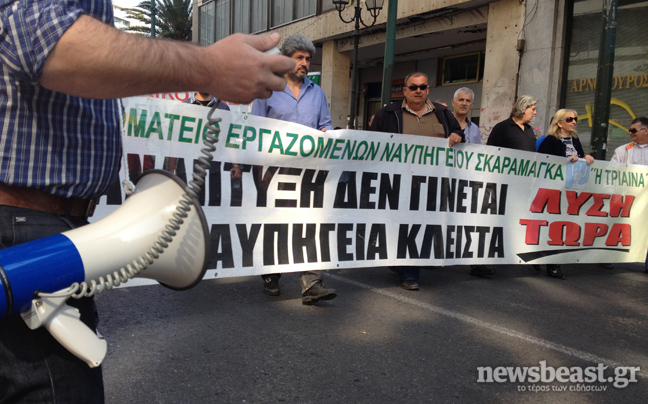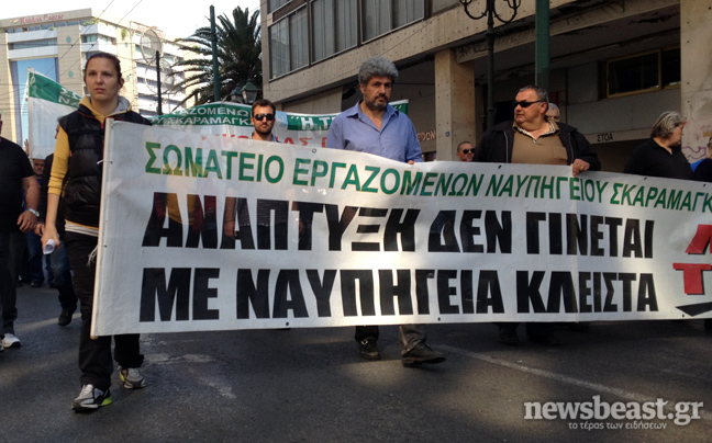 Πορεία διαμαρτυρίας προς το υπουργείο Εργασίας πραγματοποιούν αυτή την ώρα οι εργαζόμενοι στα Ναυπηγεία Σκαραμαγκά, με αίτημα την επαναλειτουργία των ναυπηγείων.