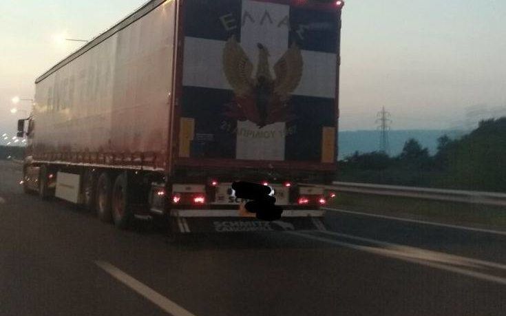 Νταλίκα να κυκλοφορεί ελεύθερη στον δρόμο με όλο το πίσω μέρος της ζωγραφισμένο με την σημαία της 21ης Απριλίου..