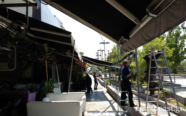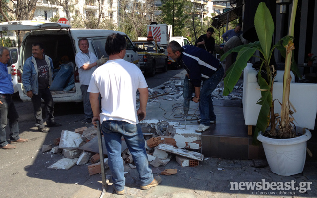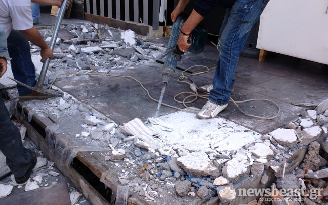 Οι κατασκευές αφαιρούνται από καταστήματα στην πλατεία της περιοχής για πολεοδομικές παραβάσεις κατάληψης δημόσιου χώρου.