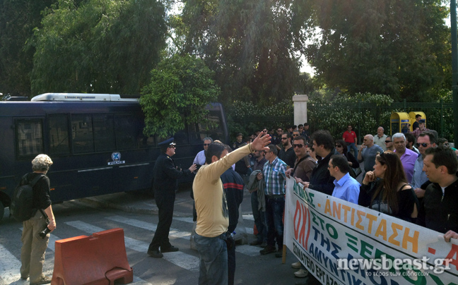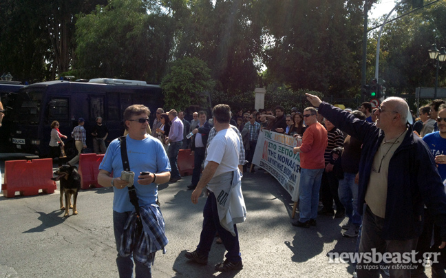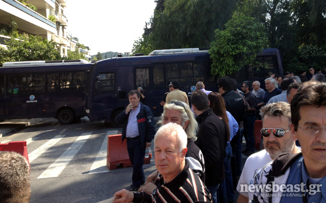 Δυνάμεις των ΜΑΤ έκλεισαν την Ηρώδου Αττικού προς το μέγαρο Μαξίμου, με αποτέλεσμα οι συγκεντρωθέντες να κλείσουν και τα δύο ρεύματα της λεωφόρου Βασιλίσσης Σοφίας, προκαλώντας κυκλοφοριακό κομφούζιο στο κέντρο.
