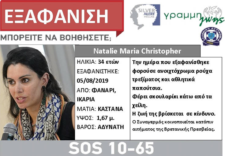 Συμπληρώθηκαν 48 ώρες από την εξαφάνιση της βρετανίδας αστροφυσικού Νάταλι Κρίστοφερ στην Ικαρία και η αγωνία κορυφώνεται για την 34χρονη, καθώς, παρά τις υπεράνθρωπες προσπάθειες που καταβάλλονται από τις Αρχές, ακόμα δεν έχει βρεθεί κανένα ίχνος της.