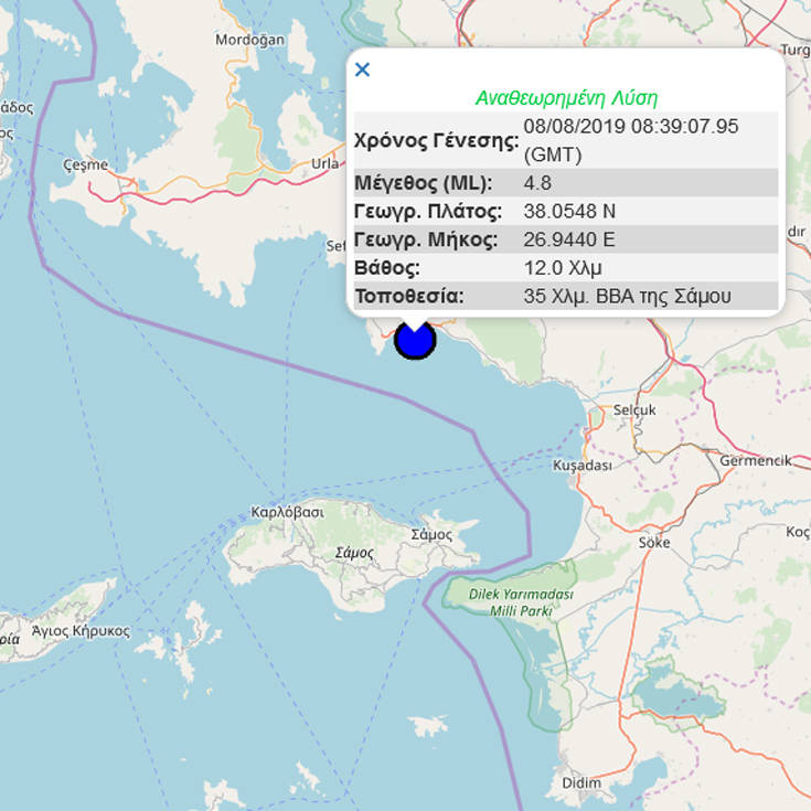 Σεισμός 4,8 Ρίχτερ σημειώθηκε στις 11:39 το πρωί 35 χλμ βόρεια-βορειανατολικά της Σάμου.